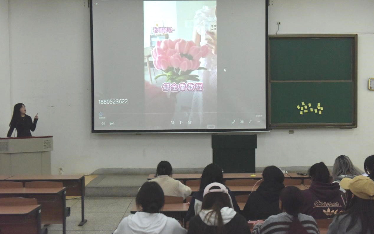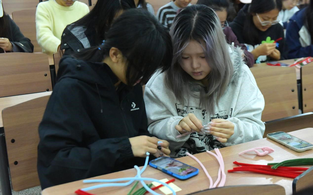 活动现场暖意融融,趣味与温情交织。大家拿起便利贴,写下对身边女性的真挚祝福,一字一句满含心意;“闹钟炸弹”互动游戏欢乐不断,同学们在紧张欢乐的氛围里拉近了彼此距离;创意手工环节,大家巧手编织扭扭棒花朵,以手作致敬自我、定格美好;在故事分享环节中,同学们踊跃讲述心中优秀女性的故事,传递榜样力量,致敬每一份独立与坚韧。