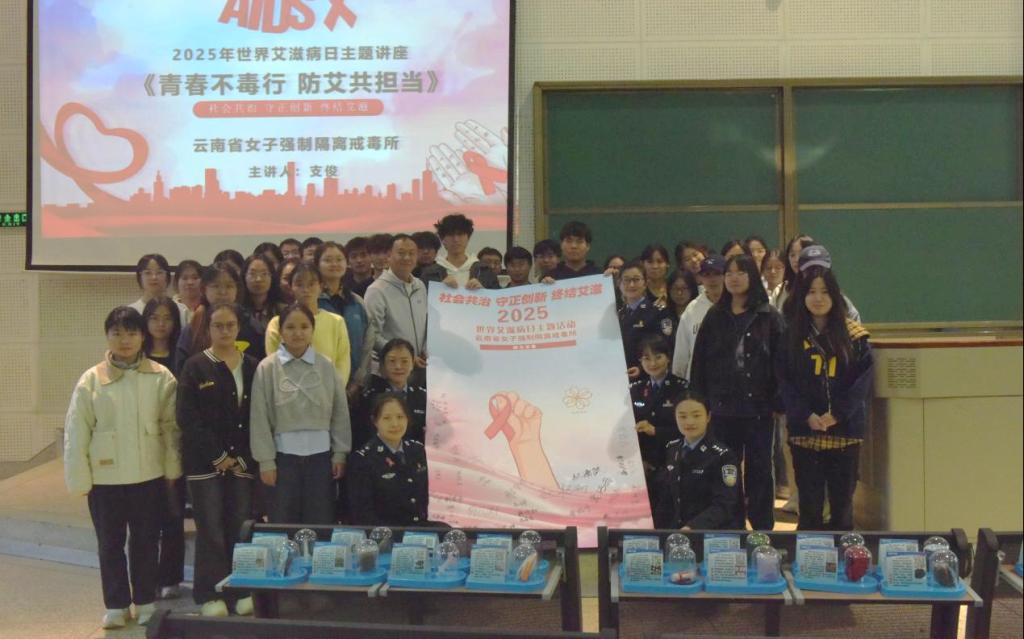 本次讲座分为禁毒宣传与艾滋预防两大板块。在禁毒宣传中,民警系统阐述毒品对国家和社会的危害,随后介绍了传统毒品以及新型毒品并展示毒品模型,直观呈现其隐蔽性与迷惑性。在防艾宣传中,民警介绍了每年12月1日“世界艾滋病日”的背景,并围绕2025年“社会共治 守正创新 终结艾滋”的宣传主题,结合戒毒人员染毒案例,讲解艾滋病传播途径与预防要点;同时通过互动问答与奖励机制,深化同学们对防艾知识的理解与记忆。