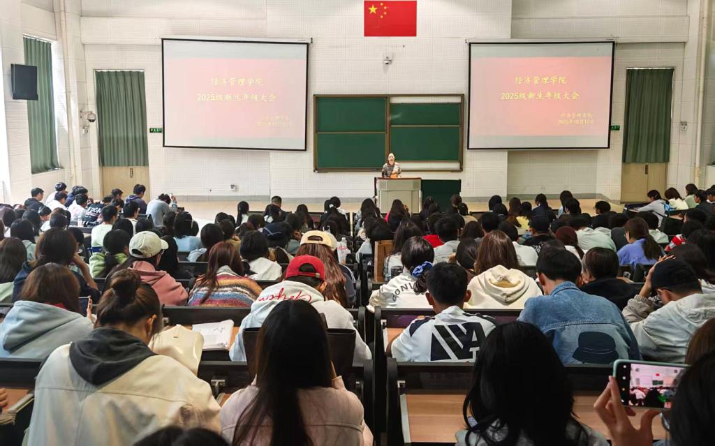 10月10日,经济管理学院(自贸学院)在博雅楼3101召开2025级新生年级大会暨新生安全教育大会。学院党委书记樊传章老师、党委副书记鲍鲲老师、年级辅导员王诗语老师及2025级全体新生共同参加。